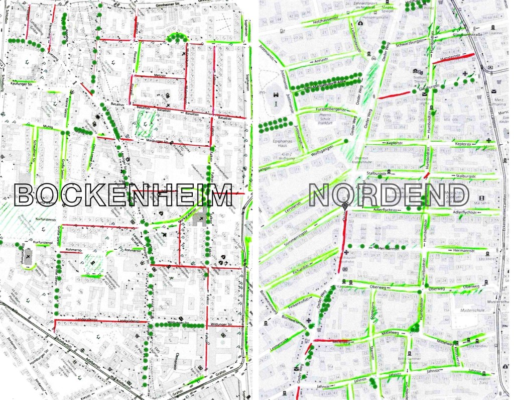 Viele Straßen im Viertel sind ohne Grün, ohne Vorgärten oder Stadtbäume, hier rot dargestellt (Klick vergrößert Karte) − im Sommer glüht der Asphalt. Dagegen das „grüne“ Nordend als Vergleich.