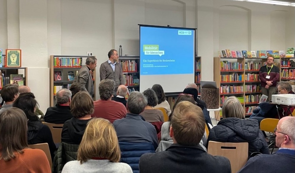 Der Andrang war so groß, dass die Bibliotheksleitung viele Interessierte abweisen musste. Die Initiative Superblock hatte eingeladen und Mathias Biemann vom VCD stellte den rund 110 Anwesenden die Ideen zum Superblock vor. Nach einer lebhaften Fragenrunde war klar: Eine große Mehrheit unterstützt diese Idee.