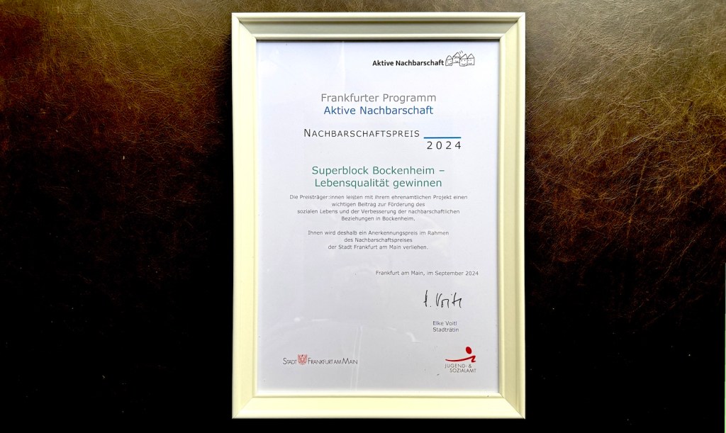 Gestern haben wir den Anerkennungspreis im Rahmen des Nachbarschaftspreises der Stadt Frankfurt a.M. erhalten, wir freuen uns! Die Preisträger:innen leisten mit ihrem ehrenamtlichen Projekt einen wichtigen Beitrag zur Förderung des sozialen Lebens und der Verbesserung der nachbarschaftlichen Beziehungen in Bockenheim.