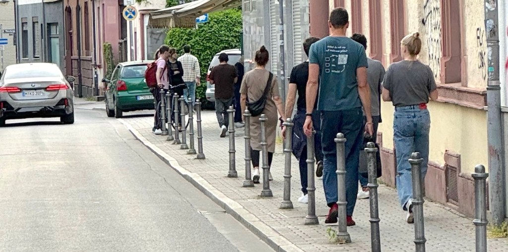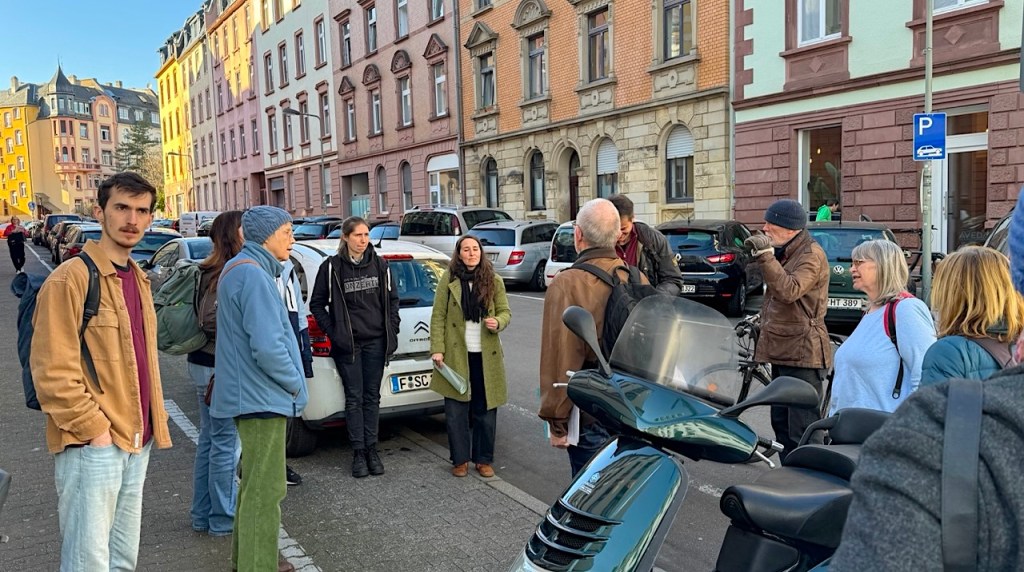 Gestern fand der vom Verein Umweltlernen e.V. organisierte Stadtteil-Walk in Bockenheim statt (Rundschau-Artikel). Diese Zukunftswerkstatt will Wege erkunden, die Menschen für den Klimaschutz zu sensibilisieren. An zwei Stationen durften wir den Teilnehmenden die Idee und Ziele des Superblocks vorstellen. Das Foto zeigt die Gruppe in der baumlosen Wurmbachstraße.