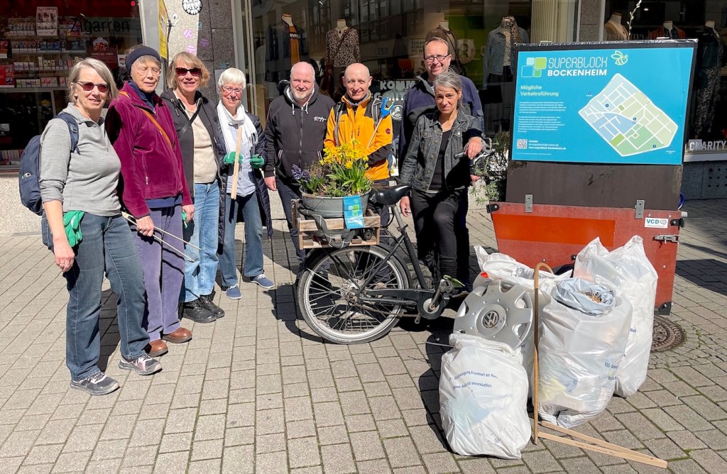 Wir „Freiwilligen“ trafen uns am 28. März auf der Leipziger Straße. Bei herrlichem Wetter und mit Elan und Spaß zogen wir gemeinsam los und säuberten Gehwege, Grünflächen und Parks von Müll, Unrat und insbesondere vielen achtlos weggeworfenen Zigarettenstummeln. Nach zwei Stunden waren die Säcke voll! „Bockenheim soll schöner, sauberer, sicherer und grüner werden!“ Jede:r kann mitmachen.