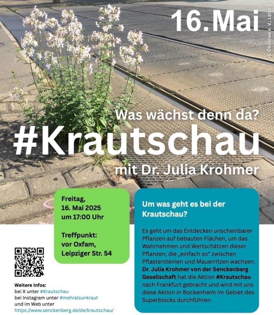 Auf der Aktion #Krautschau, zu der wir eingeladen hatten, erzählte uns Dr. Julia Krohmer von der Senckenberg-Gesellschaft mit großem Enthusiasmus von den Vorzügen der unscheinbaren Pflanzen, die zwischen den Pflastersteinen auch auf der Leipziger Straße wachsen. Wir haben dort auf einer relativ kleinen Fläche tatsächlich 50 (!!!) verschiedene Pflanzenarten gefunden! Hier geht’s weiter…