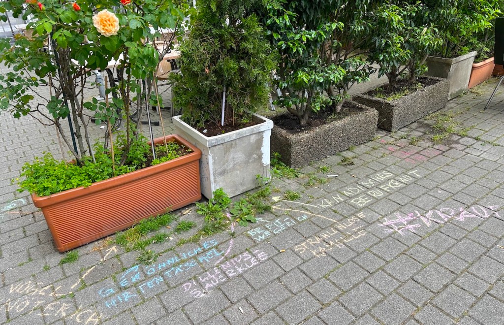 Unsere Initiative hatte Dr. Julia Krohmer eingeladen, um mit uns und allen Interessierten die #Krautschau durchzuführen. Treffpunkt war unser Lastenrad mit den Postern zum Superblock vor Oxfam, dort begannen wir, die Pflanzen mit Hilfe der App Flora Incognita zu bestimmen und dann den Namen mit bunter Kreide auf das Pflaster zu schreiben.